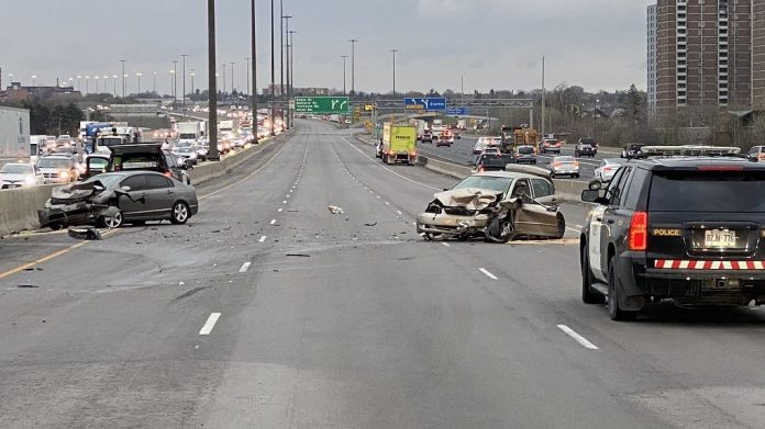 A 78-year-old woman from Mississauga is dead after a multi-vehicle crash on Highway 401 near Highway 400.