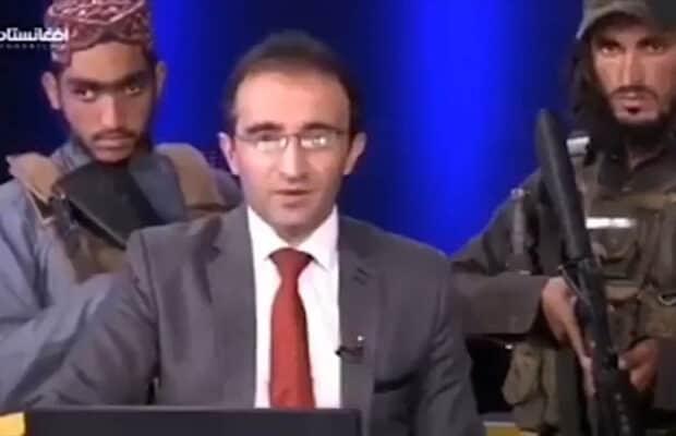 In the footage, the host of Afghan TV network Peace Studio’s Pardaz political debate program addresses his audience, reading a statement from the Taliban while two heavily armed fighters stand menacingly behind him.