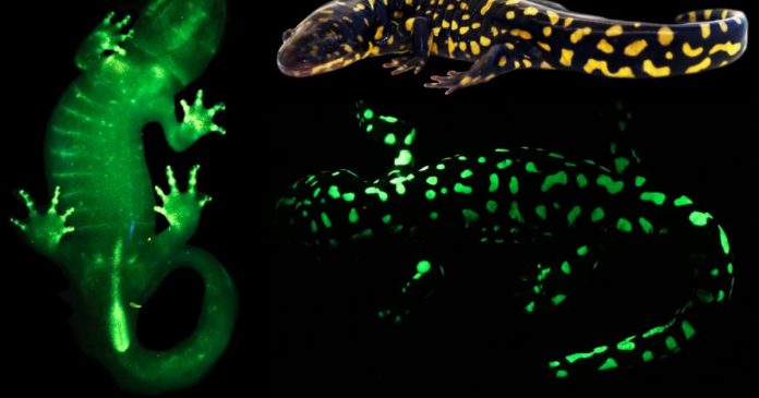 They looked at 32 amphibian species, and managed to study eight of the 10 families of salamanders. Every single one glows—some intensely, others less so. The tiger salamander in particular throws off gobs of green light. “When we imaged that species, it was really startling to both of us just how bright and brilliant the fluorescence was,” says St. Cloud State University herpetologist Jennifer Lamb, who published the paper with her colleague Matthew Davis, an ichthyologist. (A fish guy studying amphibians? Don’t worry—he studies biofluorescence under the deep blue sea too.) “We also saw fluorescence in animals that otherwise under white light might kind of look like plain Janes, that were maybe a duller brown or gray,” Lamb adds.