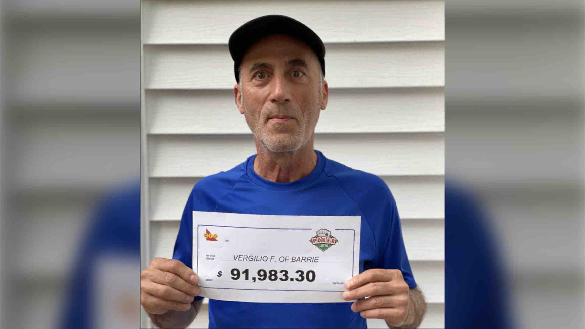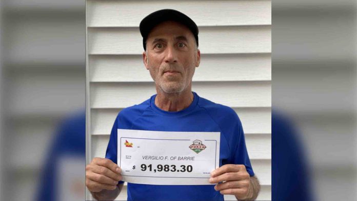According to OLG, Vergilio Fiore from Barrie, Ontario, won the Poker Lotto All In jackpot worth $86,983.30 on March 17 and an additional $5,000 off his instant portion of the play, which brought his total winnings to nearly $92,000.
