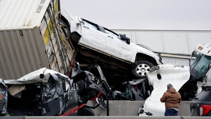 A pileup of around 100 vehicles on I-35W near downtown Fort Worth around 6:30 a.m. left six people dead and about 65 with injuries, authorities said. In Dallas, around 12:55 a.m., police said a man was driving at a high rate of speed in the 7700 block of I-45 when he lost control on the ice, swerving across four lanes of traffic, before his car rolled over a guardrail and into a light pole. He and a woman in the car were pronounced dead. A person in the backseat was critically injured.