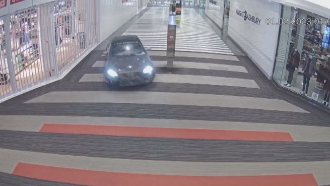 The vehicle is then seen driving erratically through a number of hallways in the shopping centre before smashing through a different exit and fleeing the scene.
