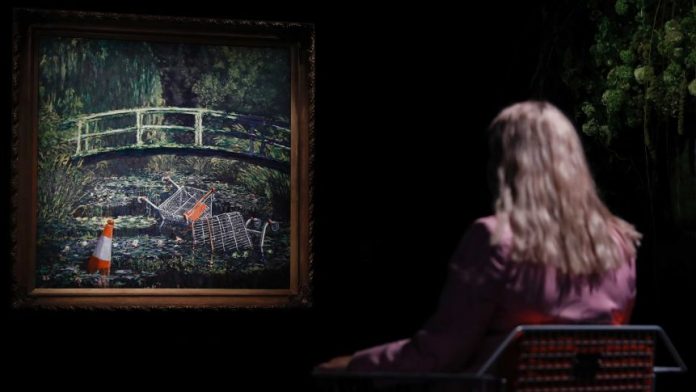 In the 2005 work, Banksy added abandoned shopping carts and an orange traffic cone to Claude Monet’s image of water lilies in his garden at Giverny.