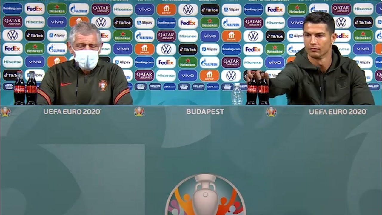 Portugal’s world-famous team captain pushed two Coke bottles away from his spot at a table before taking questions in Budapest, ahead of a Group F game against Hungary. Ronaldo then held up a bottle of water and touted it as the better alternative. “Beba agua!” he said in Portuguese. “Drink water!”