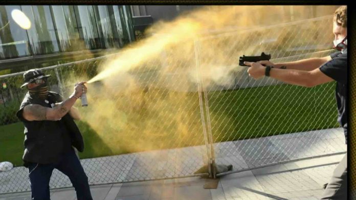 A sequence of photos of the incident captured by a Denver Post photographer appears to show Keltner slapping Dolloff in the face before the two back away from each other. The next image shows Dolloff shooting at Keltner — a shell casing is seen being ejected from his handgun — as Keltner fires a cloud of pepper spray at Dolloff.