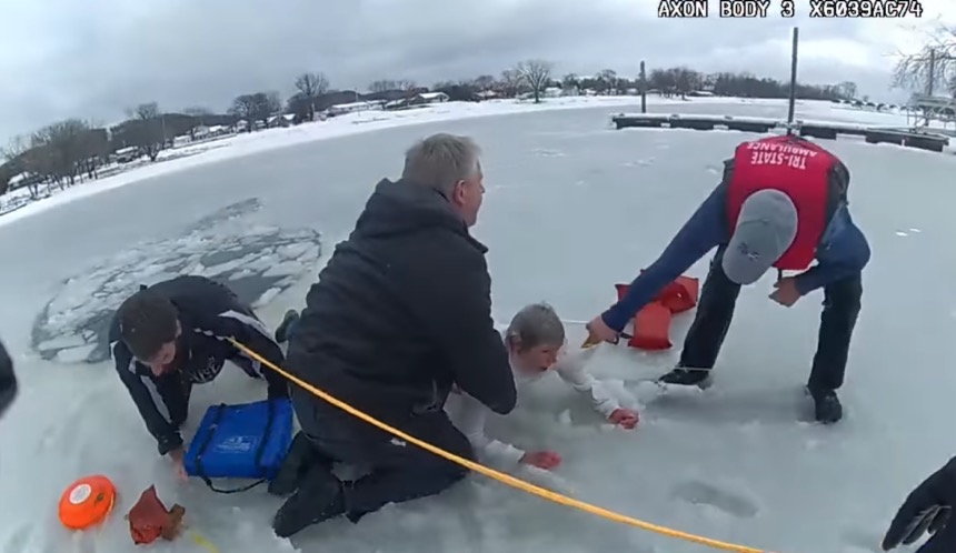 The video shows officers arriving on scene and quickly securing themselves to the shore before making their way out onto the ice and hauling her and her dog out of the water and back to safety.