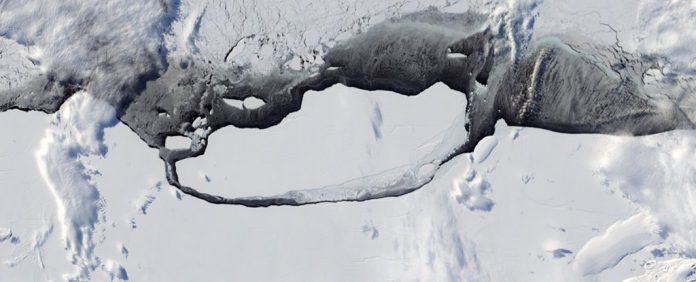 In the first half of the animation, from March through early July, you can see the large rift develop from south to north. Then, in mid-July, the huge iceberg breaks free from its ice shelf.