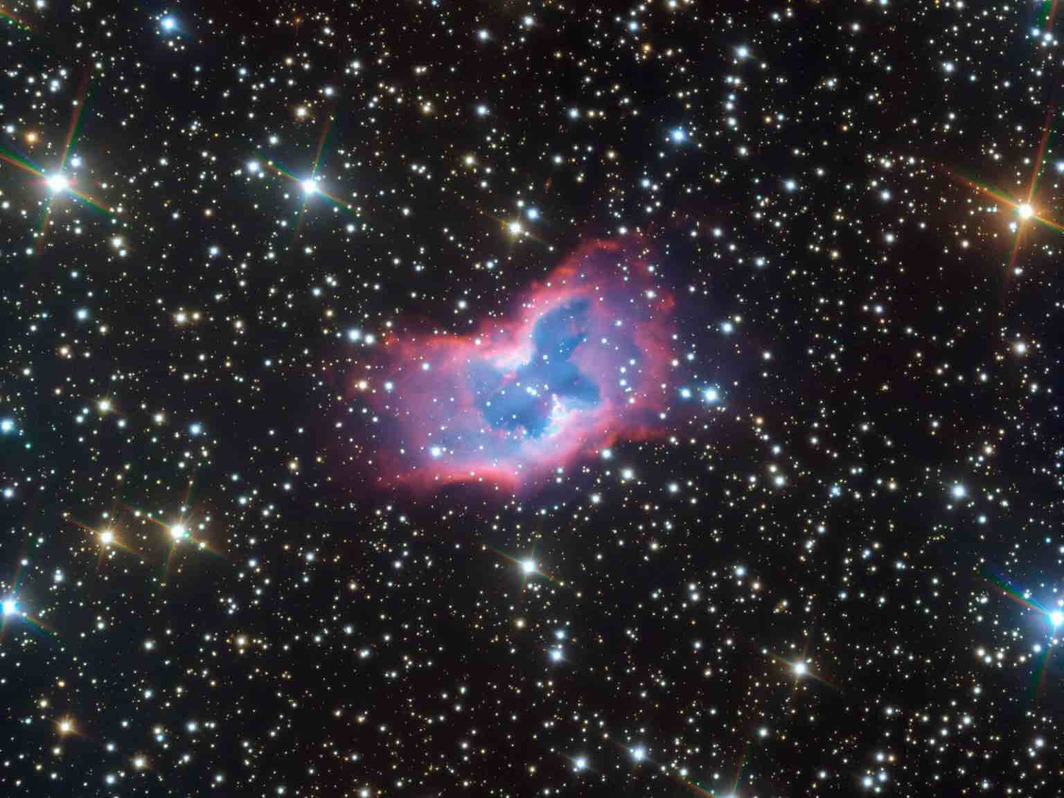 This object, located between 3000 and 6500, light-years away in the Southern constellation of Vela (The Sails), has two central stars, which are believed to give it its nearly symmetric appearance. After one star reached the end of its life and casts off its outer layers, the other star now interferes with the flow of gas, forming the two-lobed shape seen here. Only about 10–20% of planetary nebulae display this type of bipolar shape.