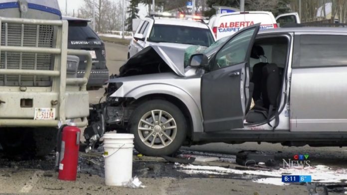 In an email statement, Edmonton police said all five injured persons were the occupants of a Dodge Journey travelling south on 76 Street at about 11:55 a.m. — the same time a tractor-trailer was performing a U-turn at 76 Street and Millbourne Road.