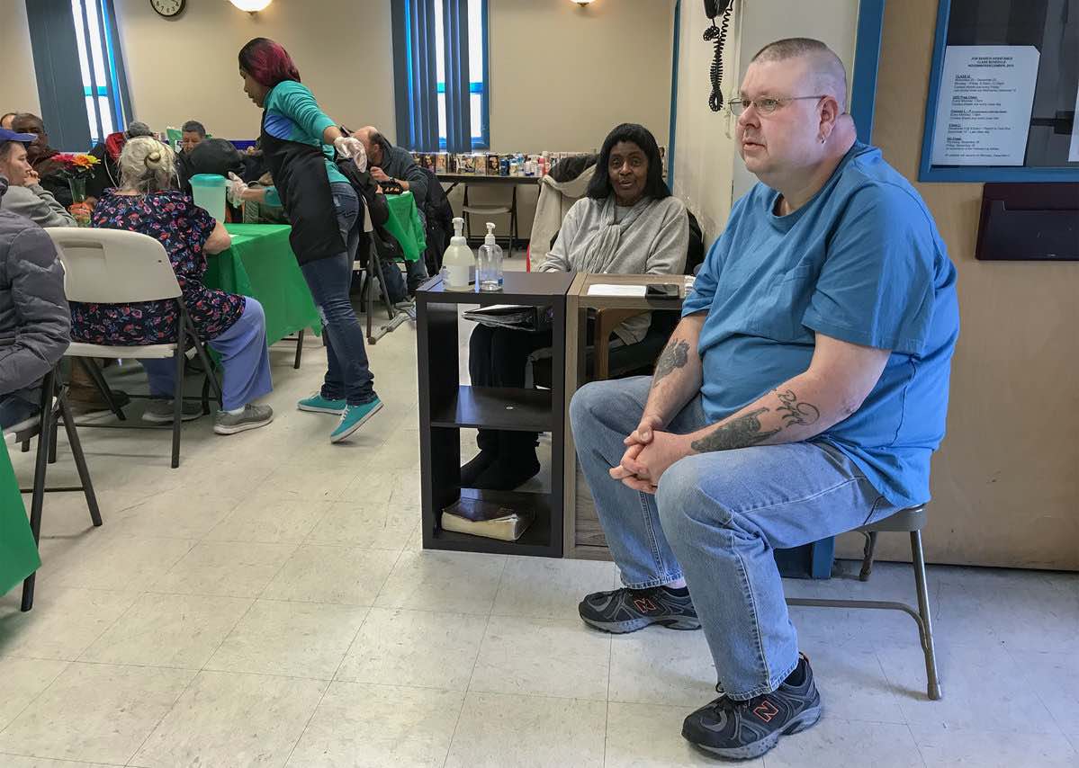 A giant of a man sat quietly on a folding chair by the door of a soup kitchen, trying to go unnoticed, rubbing a small tattoo on his hand almost impulsively, as if it were a bad memory.