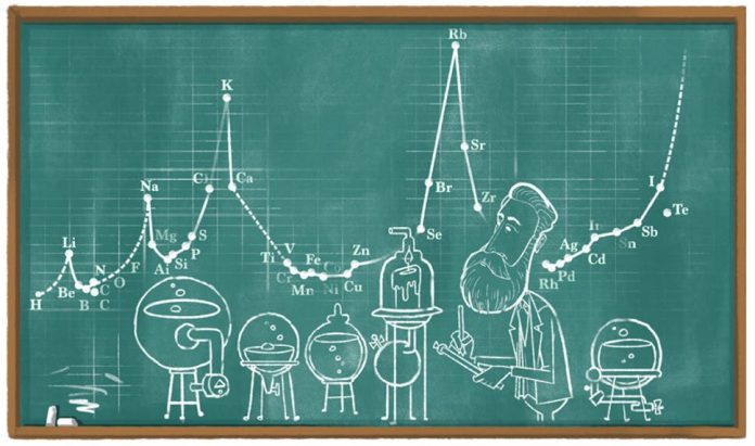 Google is celebrating the 190th birthday of the chemist and writer Julius Lothar Meyer with a Doodle depicting him experimenting in the lab to a backdrop of his vertical display of elements.