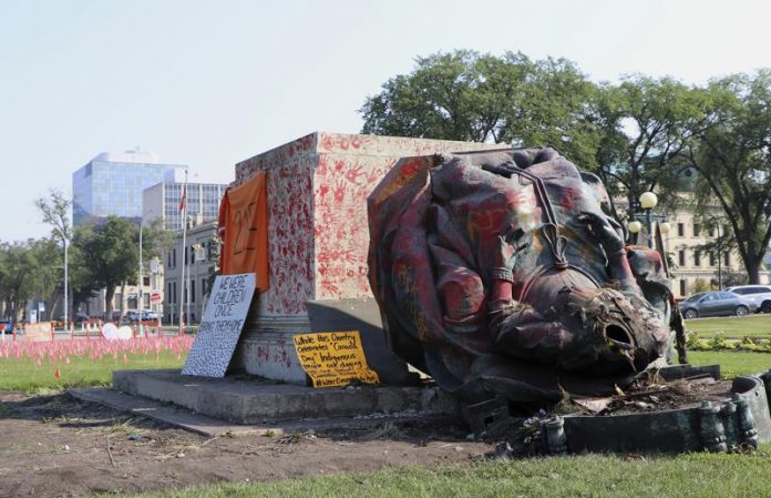 In Winnipeg, a crowd cheered as Queen Victoria’s statue fell outside the Manitoba provincial legislature. Protesters, many of whom wore orange clothing, also kicked the toppled statue and danced around it. The pedestal and statue were daubed in red paint hand marks.