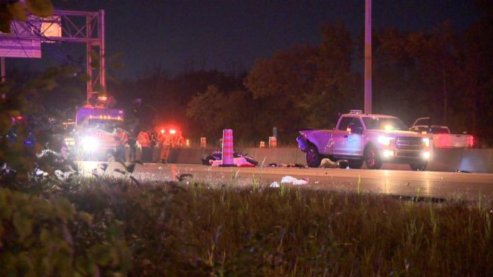 The Sûreté du Québec said the incident occurred around 9 p.m., when a motorcycle carrying two persons, both 28, entered a construction zone in the left lane of the highway just as workers at the site were in the process of closing it down.