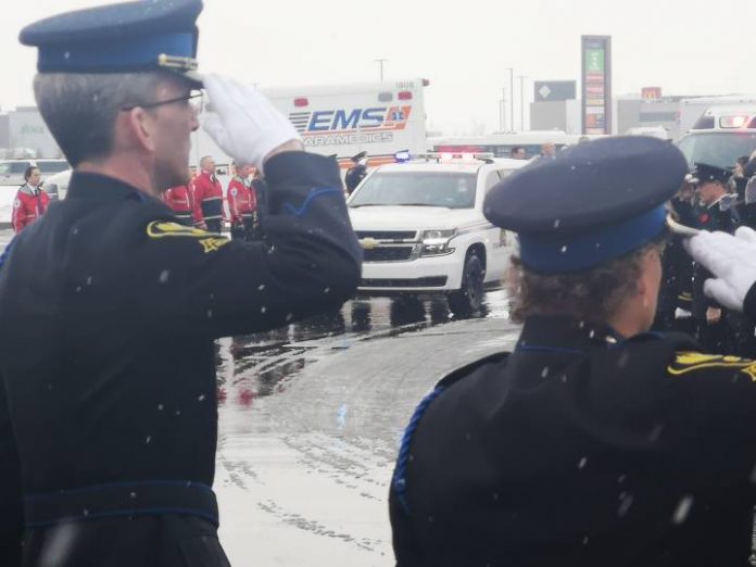 Under a light afternoon snowfall, hundreds of paramedics, firefighters and police officers lined the entry road to Regina’s Living Hope Alliance Church.