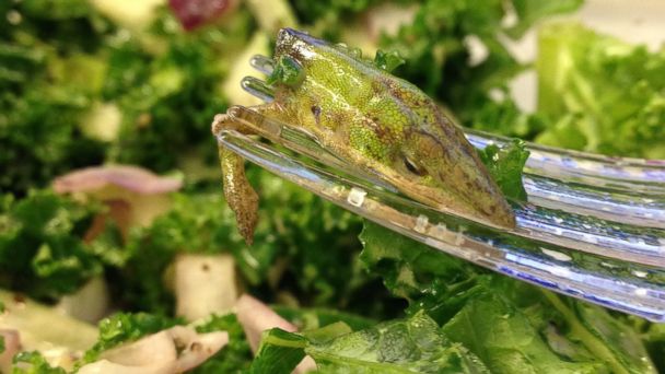 Woman vomits after sticking her fork into dead lizard in a store-bought lettuce.