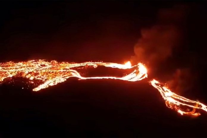Initial aerial footage, posted on the Facebook page of the Icelandic Meteorological Office, showed a relatively small eruption so far, with two streams of lava running in opposite directions. The glow from the lava could be seen from the outskirts of Iceland’s capital, Reykjavík, which is about 32 kilometers (20 miles) away.