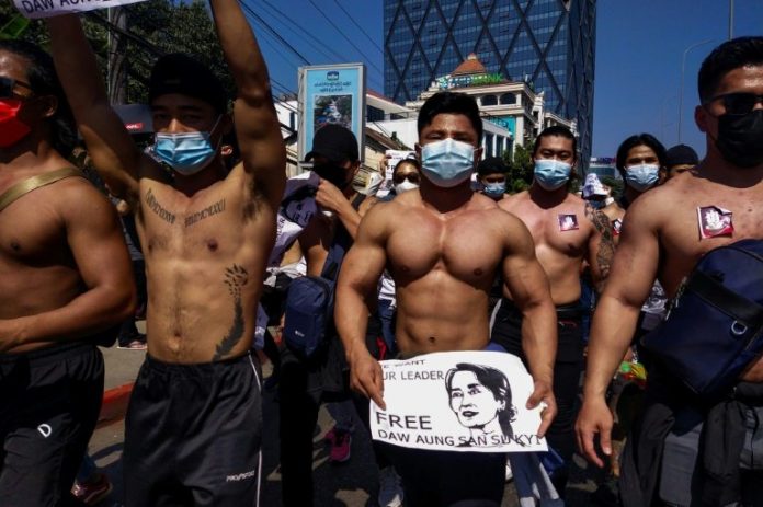 The Myanmar military might have real weapons but some anti-coup protesters have guns of their own — showing off their ripped biceps as they pose with “free Aung San Suu Kyi” posters.