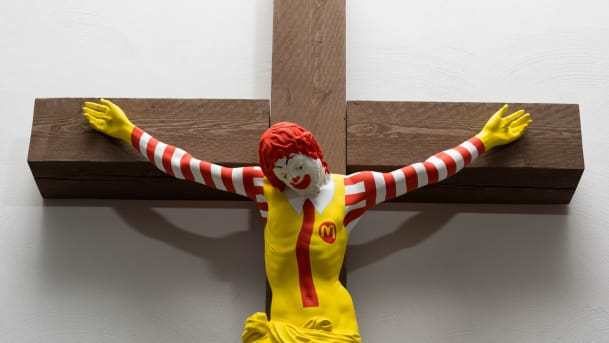 The depiction of a crucified Ronald McDonald, sculpted by Finnish artist Janei Leinonen, and part of the musuem’s “Sacred Goods” exhibit, has been on display since August.