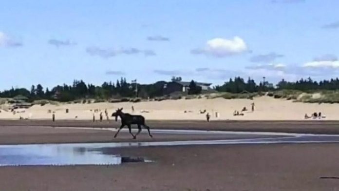 Unfortunately, the moose then headed in the direction of Parlee Beach, where the Department of Tourism said about 1,500 people were enjoying the water amid Monday’s heat.