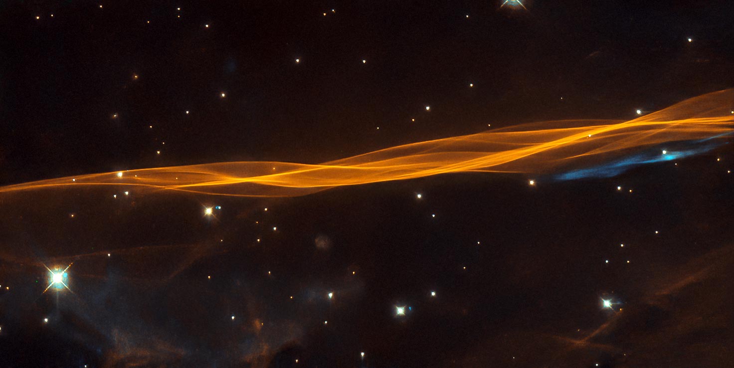 While appearing as a delicate and light veil draped across the sky, this image from the NASA/ESA Hubble Space Telescope actually depicts a small section of the Cygnus supernova blast wave, located around 2400 light-years away. The name of the supernova remnant comes from its position in the northern constellation of Cygnus (The Swan), where it covers an area 36 times larger than the full moon.