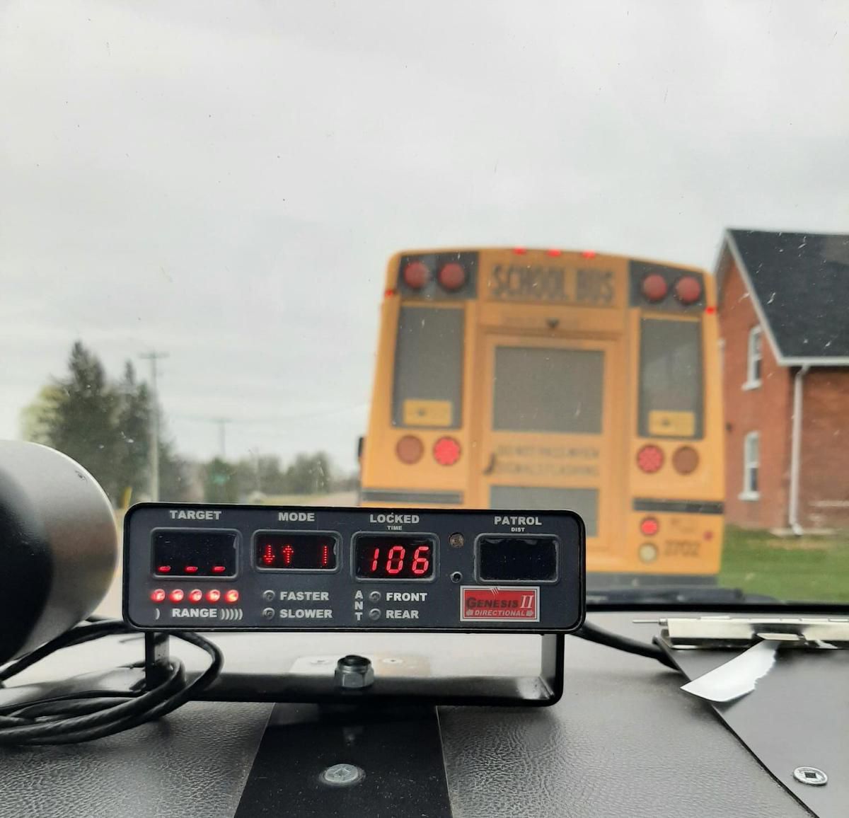 Ontario Provincial Police in Upper Ottawa Valley say a 54-year-old school bus driver has been charged after being clocked doing 106 km/h in a 60 km/h zone on Tuesday afternoon.