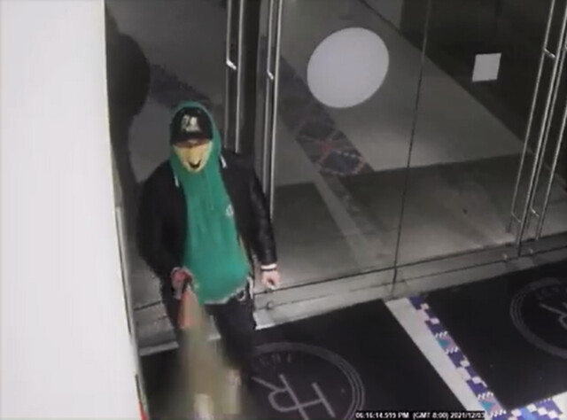 Police are unsure of the person’s gender, but believe they’re in their 20s. At the time of the theft the suspect was wearing a green hoodie, yellow face covering, and a black baseball cap with a distinctive white logo.
