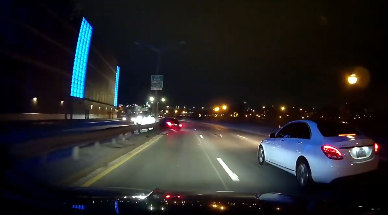 In any case, the resulting crash proved debilitating for the car, as it bounced from the concrete barrier into the metal guardrail on the left side of the road, catching air and doing a 90-degree spin before stopping. The white Mercedes thankfully had time to maneuver past its German sibling.
