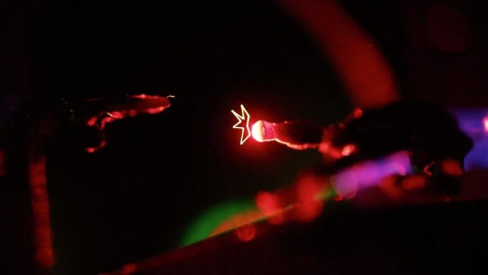 The displays use technology developed by Smalley and his team in 2018. They employ the use of “optical trap displays,” where a single particle is trapped in the air with a laser beam and then rapidly moved around, creating a trail of light suspended in the air.