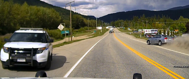 The officer radioed ahead and a roadblock was established at the east end of Bruhn Bridge close to Sicamous. Police at the roadblock laid a spike belt across the road.