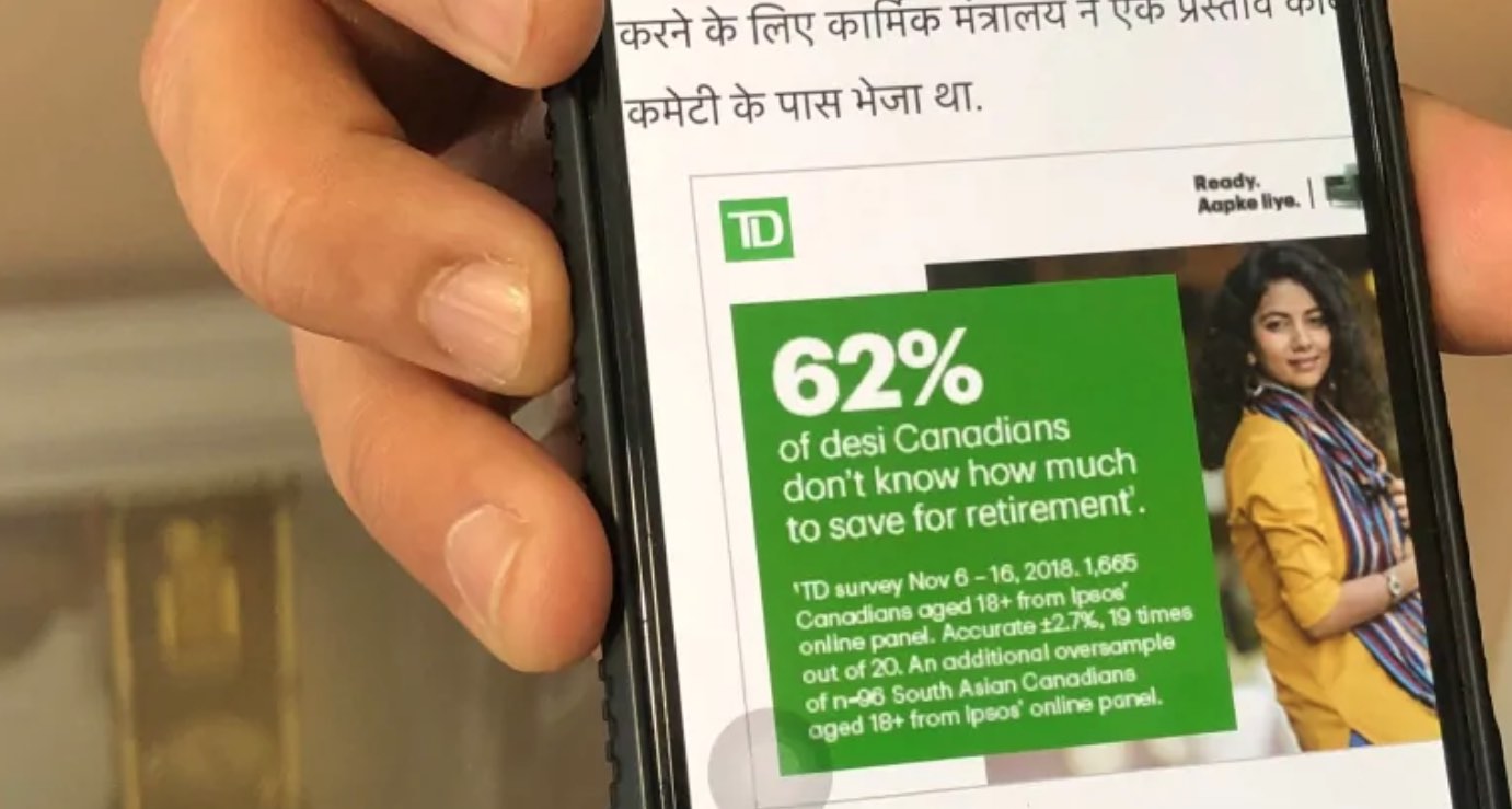 TD’s ad, which could be seen on both social media platforms and the web, featured videos and pictures with the tagline: “62 per cent of desi Canadians don’t know how much to save for retirement.”