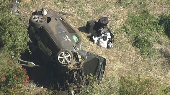 Aerial footage over the scene of the accident showed a car on its side with the front end heavily damaged. The wreckage appeared to be just off the side of a road on a hillside pic.twitter.com/r7cJhKwLLm