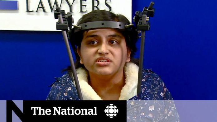 Patel, who wears a halo head brace for her neck injury, appeared at a news conference in Edmonton with her husband Suraj, 31, who was also hurt in the crash.