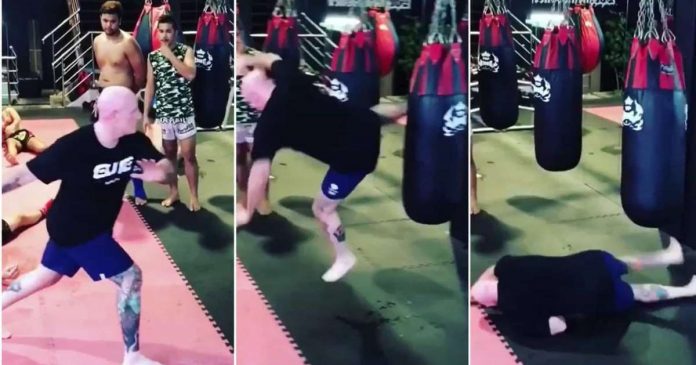 Grant Waterman is a referee and former MMA fighter. He decided to demonstrate a kick during a training session in Bangkok, Thailand, but failed miserably.